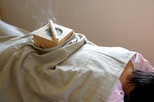 専用の木箱の中に灸を入れ、その上から温める温熱療法のことです。広範囲を長時間温めることができ、直接地肌に付けないため、火傷や煙による影響を抑えることができます。