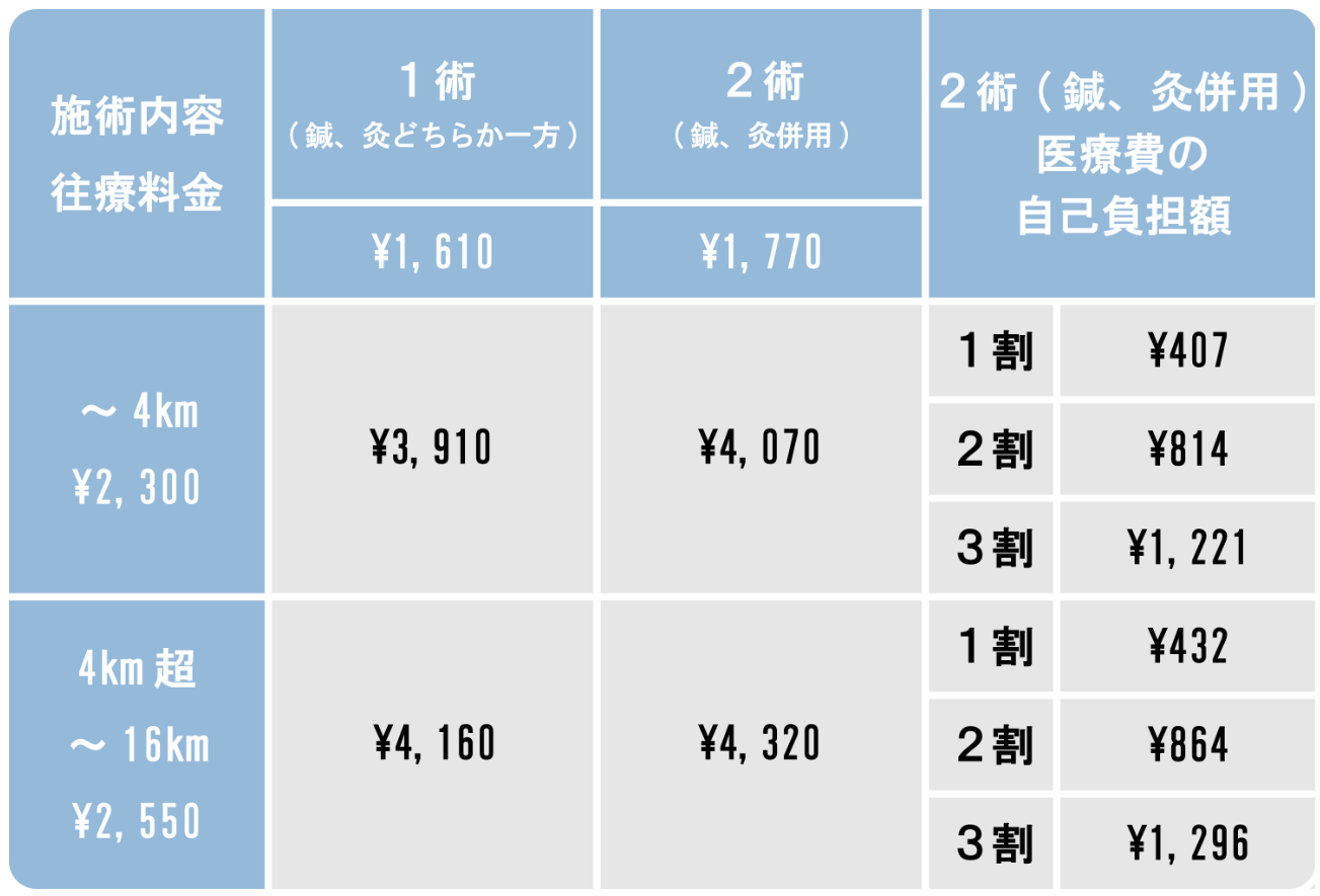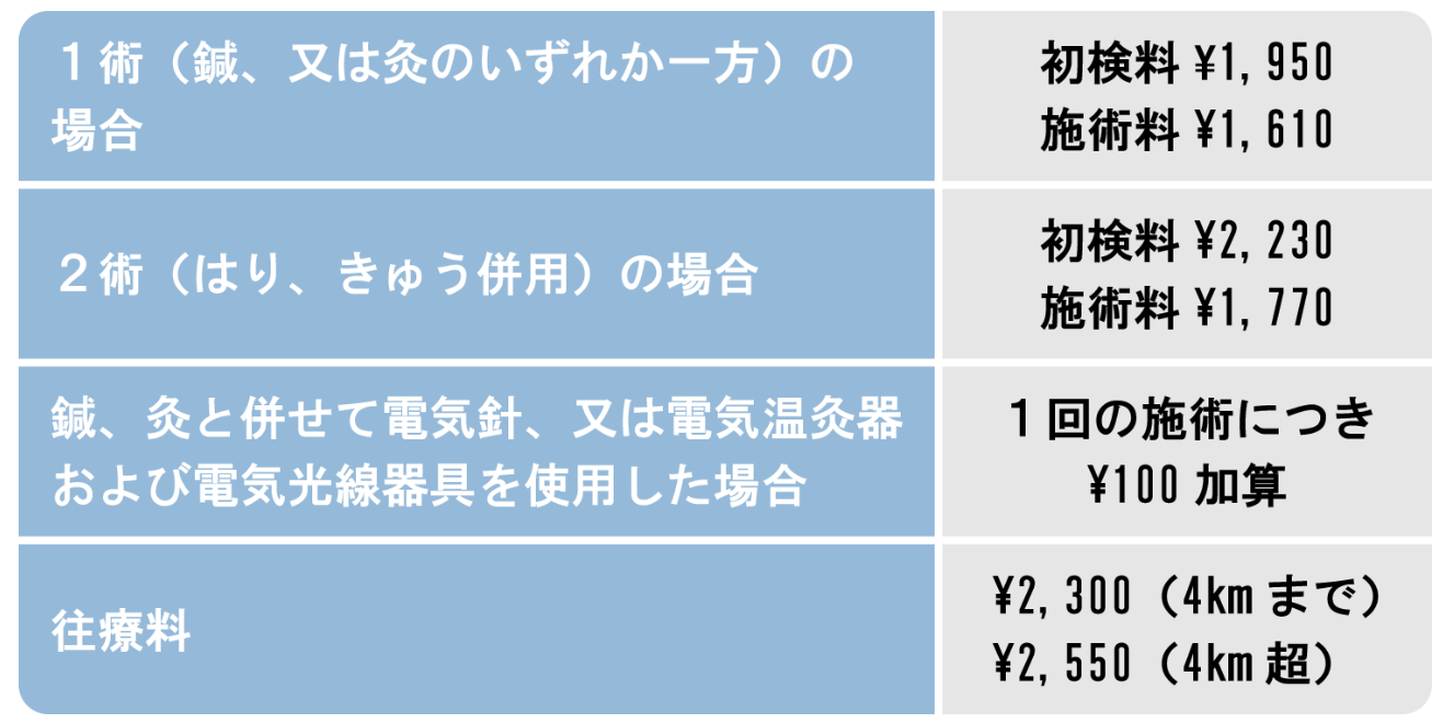 鍼灸保険料金について 2026.02.262023.03.31 目次 鍼灸施術鍼灸保険&訪問鍼灸マッサージ 鍼灸施術 鍼灸プラン 料金(税込) 部分鍼灸治療(実費) 4,400円 全身鍼灸治療(実費) 8,800円 部分鍼灸+筋膜整体 8,800円 全身鍼灸+筋膜整体 13,200円 鍼灸保険&訪問鍼灸マッサージ